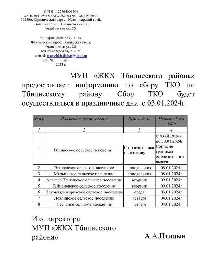 МУП «ЖКХ Тбилисского района» предоставляет информацию по сбору твердых коммунальных отходов по Тбилисскому району. Сбор твердых коммунальных отходов на территории Тбилисского сельского поселения будет осуществляться в праздничные дни с 03.01.2024г. по 31.01.2024 г. согласно графика еженедельного вывоза...