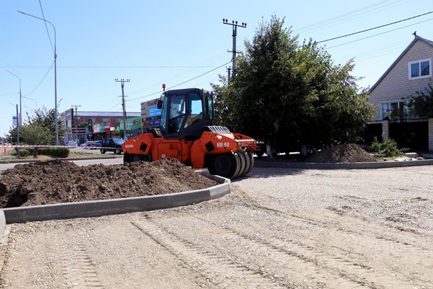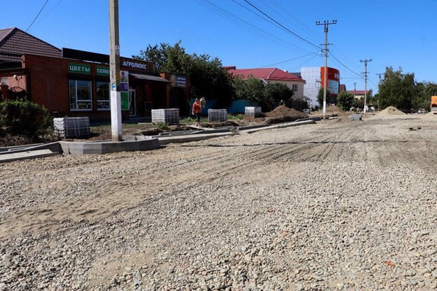 Продолжаются работы по благоустройству общественной территории по улице Октябрьской в ст-це Тбилисской. Сотрудники подрядной организации приступили к укладке тротуарной плитки, уже выполнены работы по подготовке основания для асфальтного покрытия.