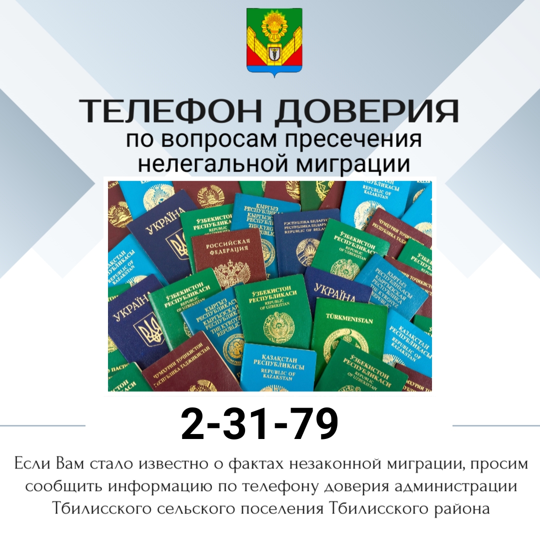 Если Вам стало известно о фактах правонарушений в сфере миграционного законодательства, то призываем сообщить об этом в администрацию Тбилисского сельского поселения Тбилисского района по тел. 2-31-79. Территориальная комиссия по профилактике правонарушений.