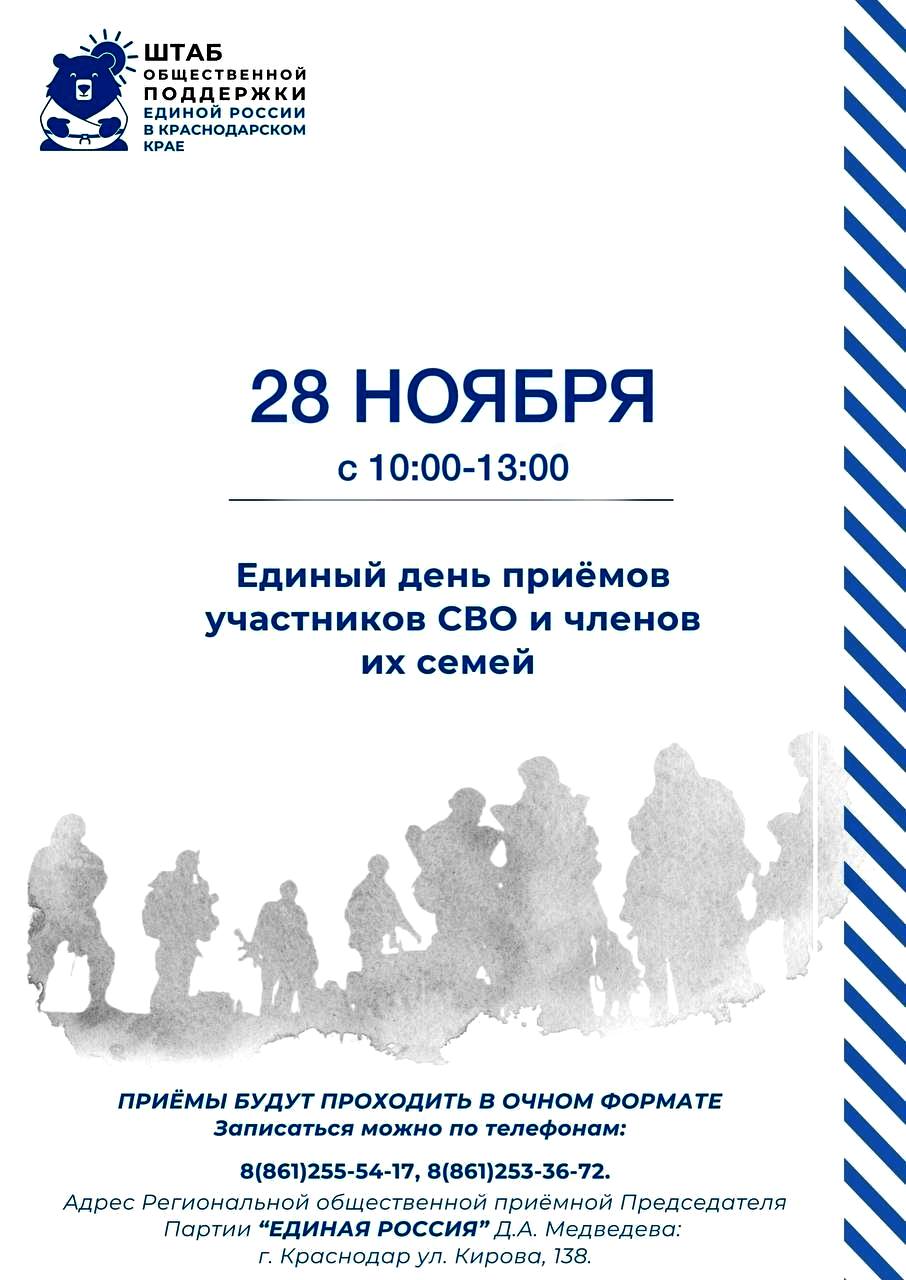 28 ноября 2025 года, состоится Единый день приёмов для участников специальной военной операции и членов их семей. Центральная площадка будет работать в региональной общественной приёмной партии по адресу: Краснодар, ул. Кирова, 138. Консультативную помощь окажут представители профильных министерств, краевого военкомата, Ассоциации юристов России, депутаты. Кроме того, обращения будут приниматься во всех местных отделениях партии «Единая Россия» — адреса и телефоны опубликованы на сайте https://vk.cc/cRER3X Напоминаем, что актуальная информация о выплатах, возможностях реабилитации и контактах всех ведомств доступна на сайте https://vk.cc/cRERaE