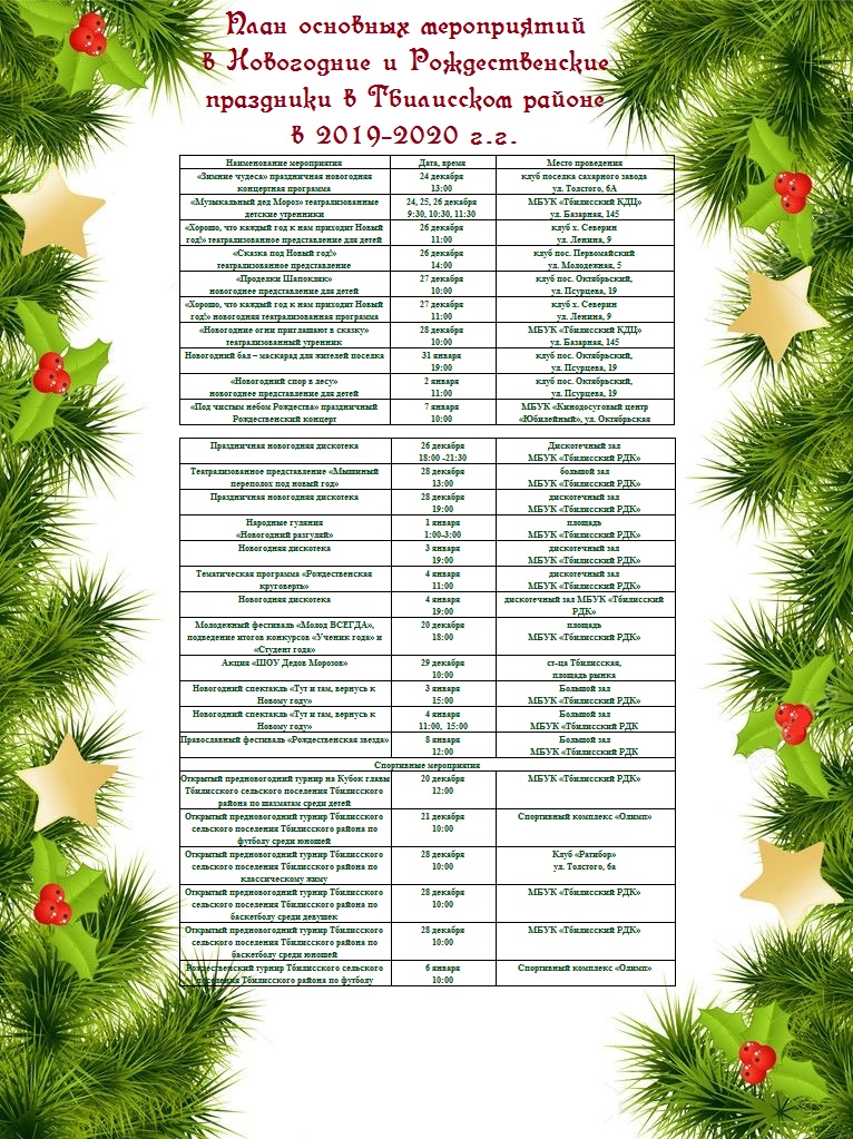 План основных мероприятий в Новогодние и Рождественские праздники.