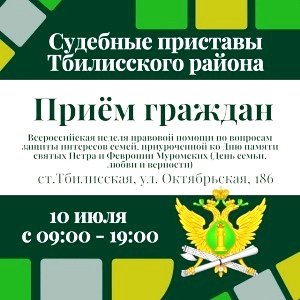 10 июля с 9:00 до 19:00 часов судебные приставы Тбилисского района проведут прием граждан по вопросам защиты интересов семей. Правовая помощь в пределах компетенции Федеральной службы судебных приставов будет оказываться по следующим категориям исполнительных производств: - взыскание алиментов; - передача ребенка; - обеспечение жильем детей-сирот и детей, оставшихся без попечения родителей; - обеспечение жизненно важными лекарственными препаратами и др. Приём пройдёт без предварительной записи по адресу ст. Тбилисская, ул. Октябрьская, № 186.