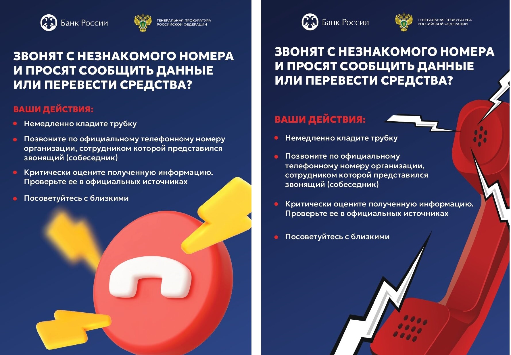 В России проходит информационная кампания по кибербезопасности «Клади трубку», организованная Банком России, Министерством внутренних дел и Генеральной прокуратурой... Клади трубку без разговоров! Это самый действенный способ противостоять телефонным мошенникам и сохранить свои деньги. Если вам звонят и представляются сотрудниками Центрального Банка, Минфина России или правоохранительных органов, то вы столкнулись с финансовыми мошенниками! Не сообщайте незнакомцам во время телефонного звонка: логины и пароли от банковских приложений; номера и пин-коды банковских карт; код из СМС и другие
