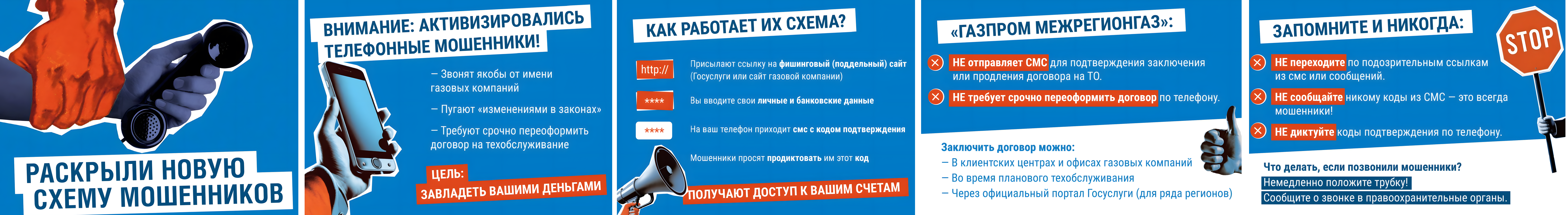 Осторожно, мошенники! Злоумышленники звонят по телефону и представляются сотрудниками газовых компаний. Запомните: «Газпром межрегионгаз» никогда не отправляет СМС для подтверждения заключения или продления договора на ТО и не требует срочно переоформить договор по телефону. Ваша безопасность в ваших руках.