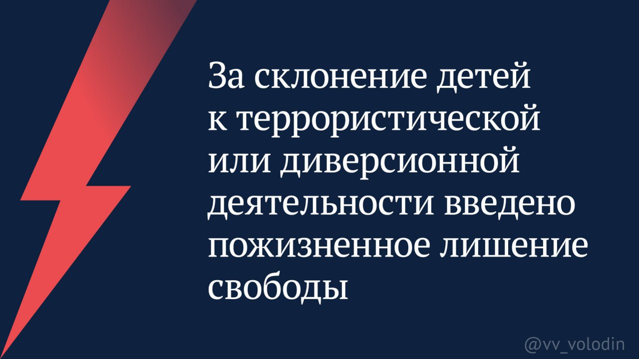 11 ноября 2025 года Государственная Дума приняла закон, значительно ужесточающий уголовную ответственность за склонение несовершеннолетних к участию в диверсионной или террористической деятельности (в том числе через Интернет). Об этом сообщил спикер Госдумы Вячеслав Володин (https://t.me/vv_volodin/1299), подчеркнув, что новые нормы призваны усилить защиту детей и повысить безопасность страны.