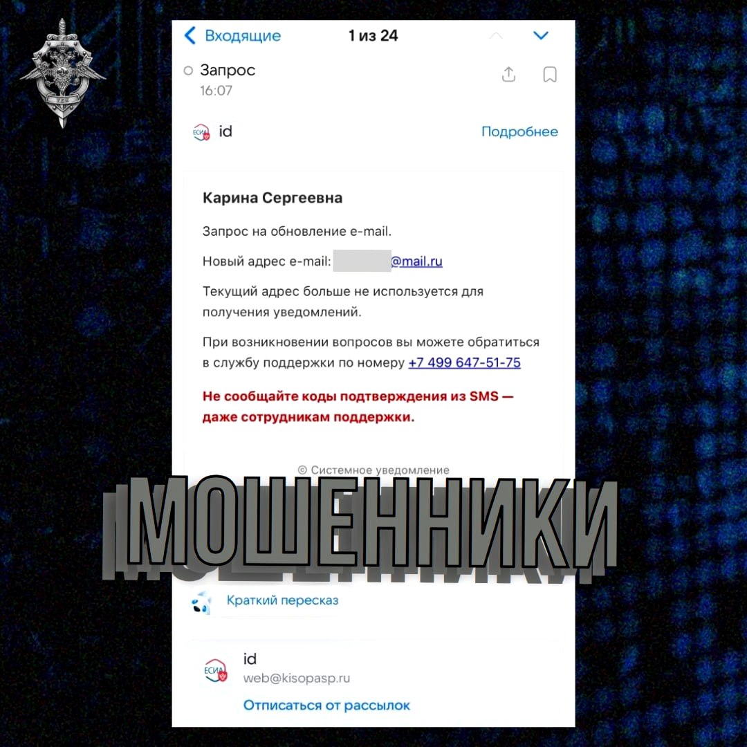 В приложении мошенническая рассылка, которая должна убедить пользователя позвонить злоумышленникам по номеру «техподдержки». Мошенники используют схожие с официальными логотипы, адресно обращаются к пользователю и даже рекомендуют никому не сообщать коды подтверждения из SMS. Но все это обман. Единственный адрес, с которого вам могут написать «Госуслуги» - no-reply@gosuslugi.ru
